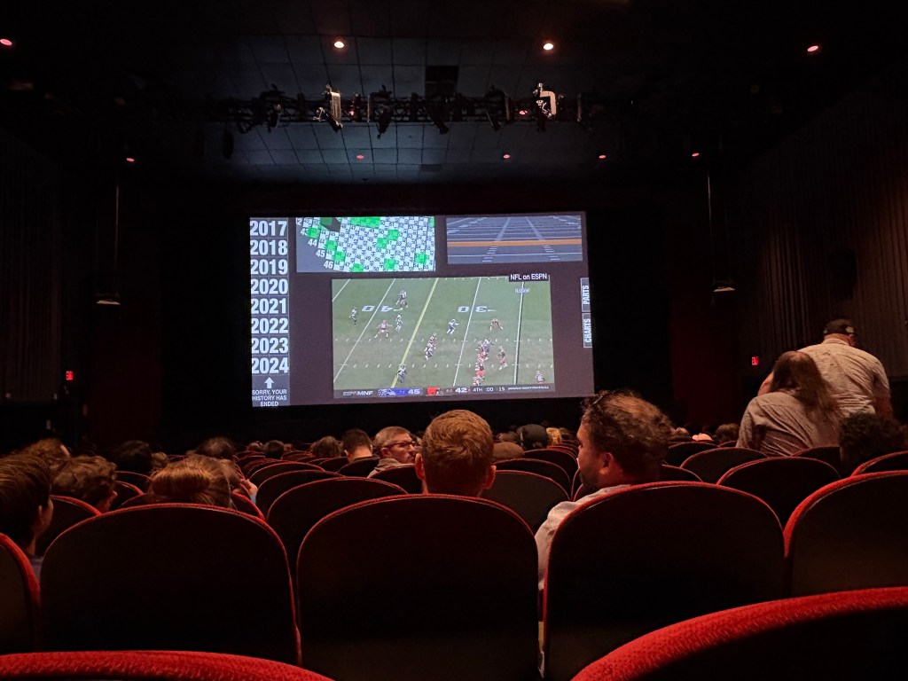 I was lucky enough to go only two blocks from my apartment to a screening of “Scorigami Part 4” at the SVA Theatre. Everyone from Secret Base/Vox Media was there, cameras and all, and it was nearly a sold out show. Many people came to see what the future of football scoring would become — visualized as towering blocks of data on a grid. Trust me, it’s actually more appealing than it sounds.