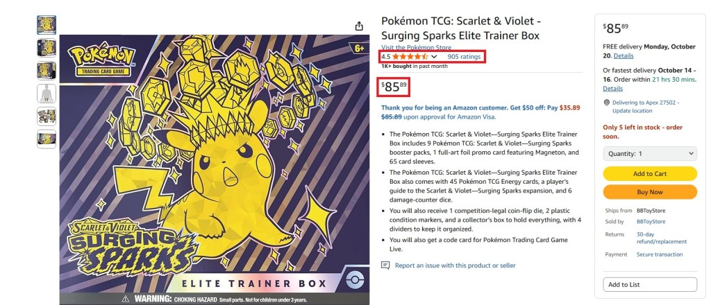 As you can see, this is a listing for a Surging Sparks Elite Trainer Box on Amazon. First thing I check is the price: $85.89. Modern set Elite Trainer Boxes always come with nine booster packs. Nine boosters times $10 = $90. It passes the $10 apiece rule.